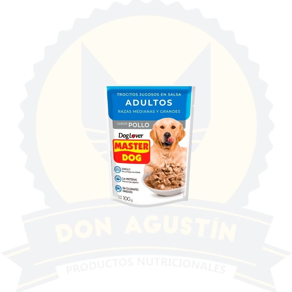 Ofrece a tu perro adulto una experiencia de sabor irresistible con los pouches de Master Dog sabor Pollo. Este alimento húmedo de alta calidad proporciona una nutrición completa y balanceada para mantener la vitalidad de tu mascota.